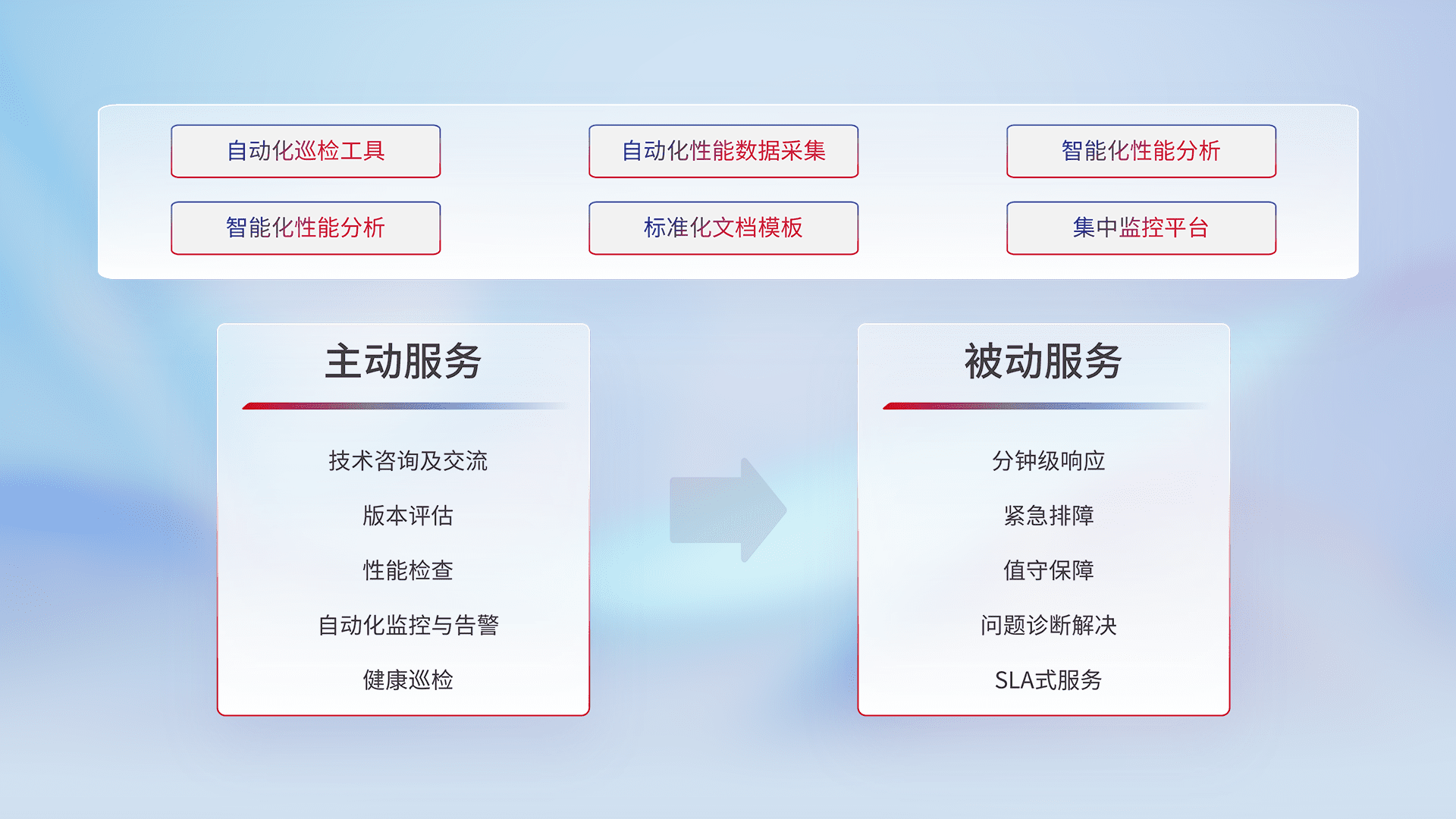 智能化工具和标准化文档,,保障服务质量,,提供主动服务(包含技术咨询、、、、版本评估、、性能检查、、、自动化监控与告警、、、健康巡检)和被动服务包含(分钟级响应、、、、紧急排障、、、、值守保障、、、问题诊断解决、、、、SLA服务)。。。。